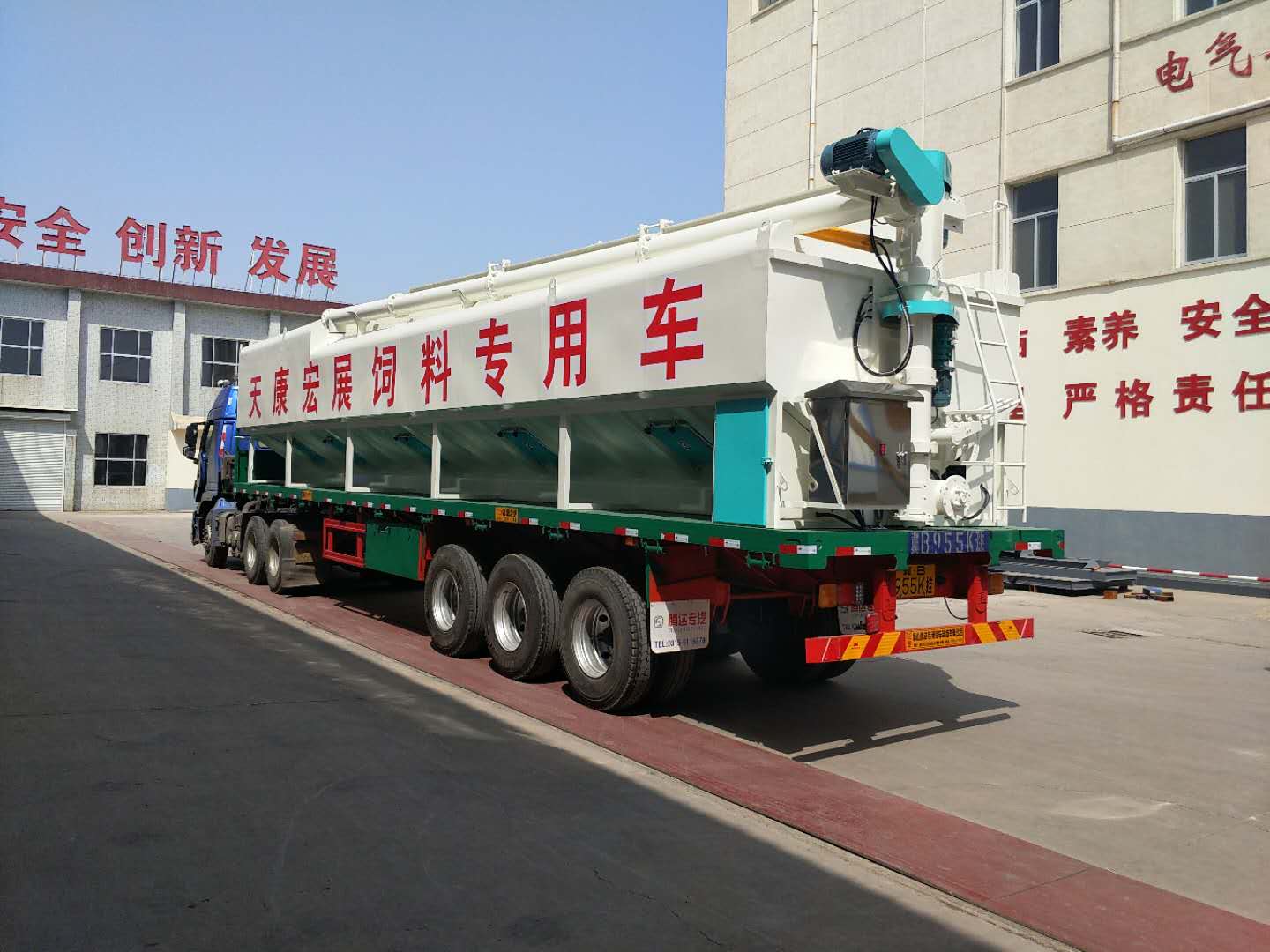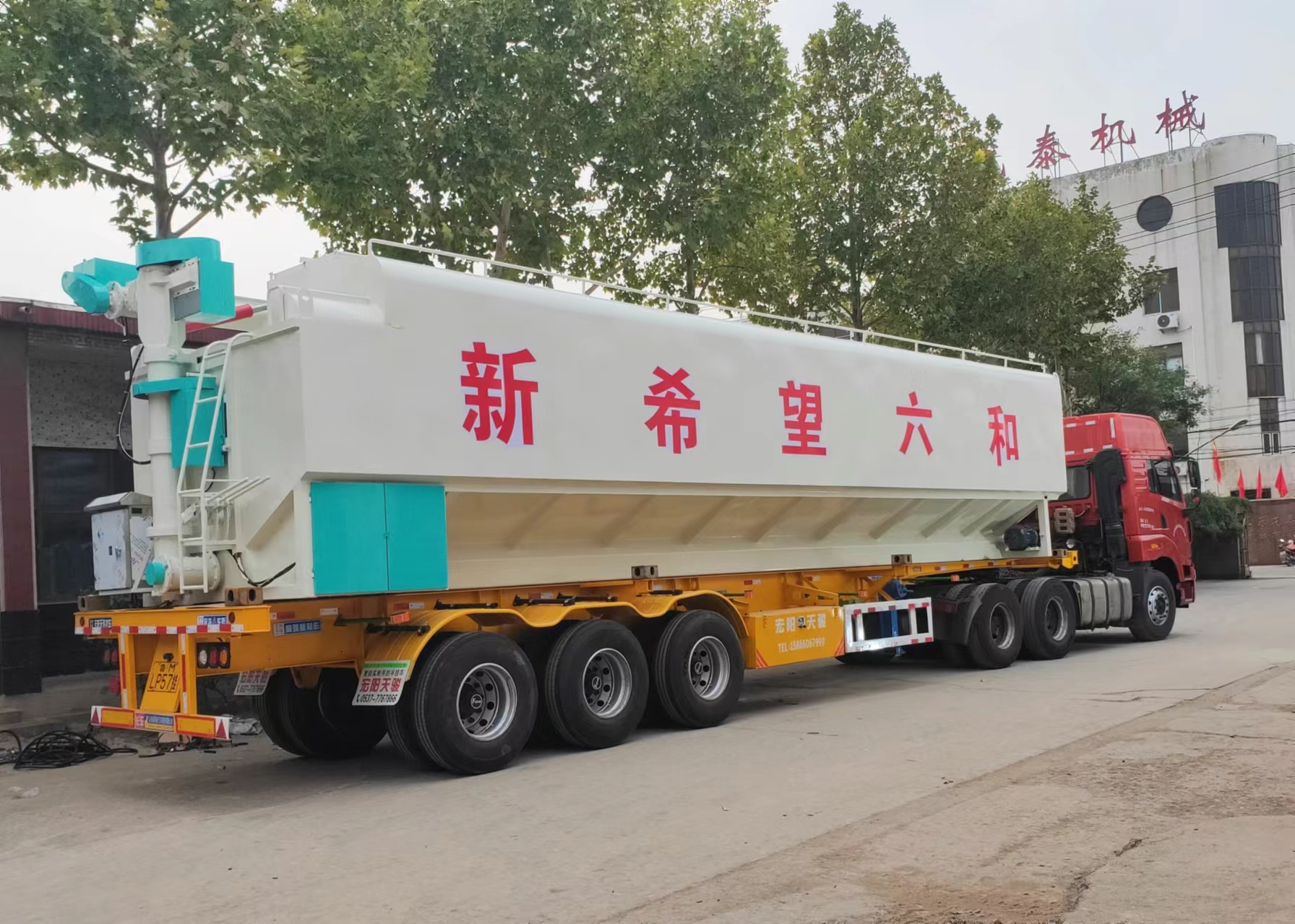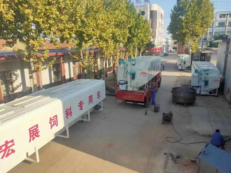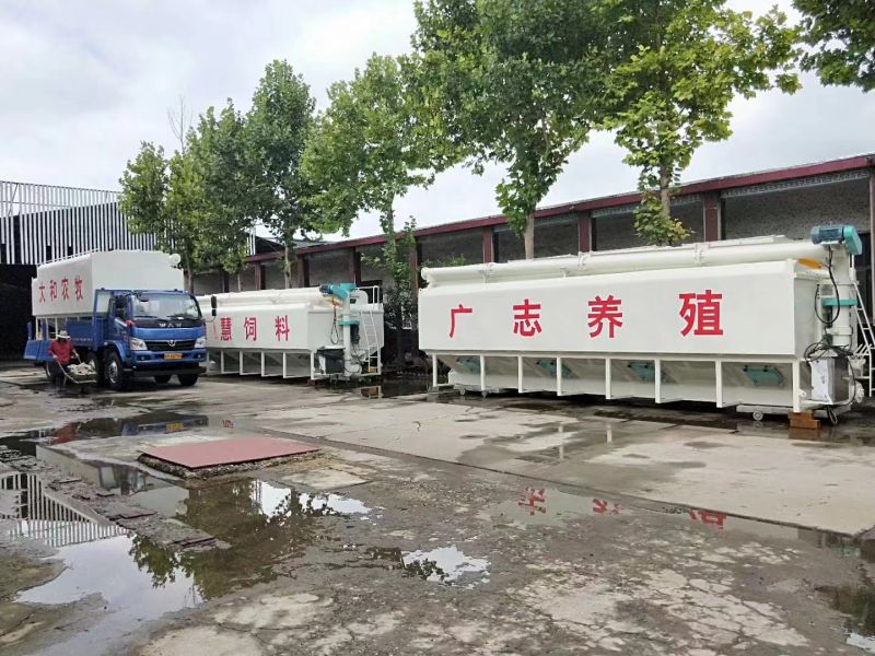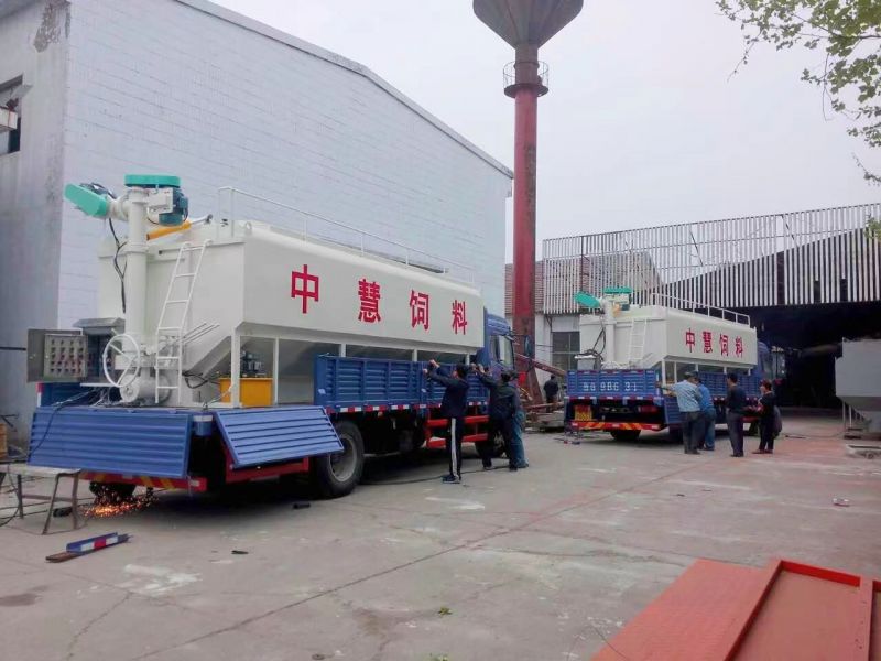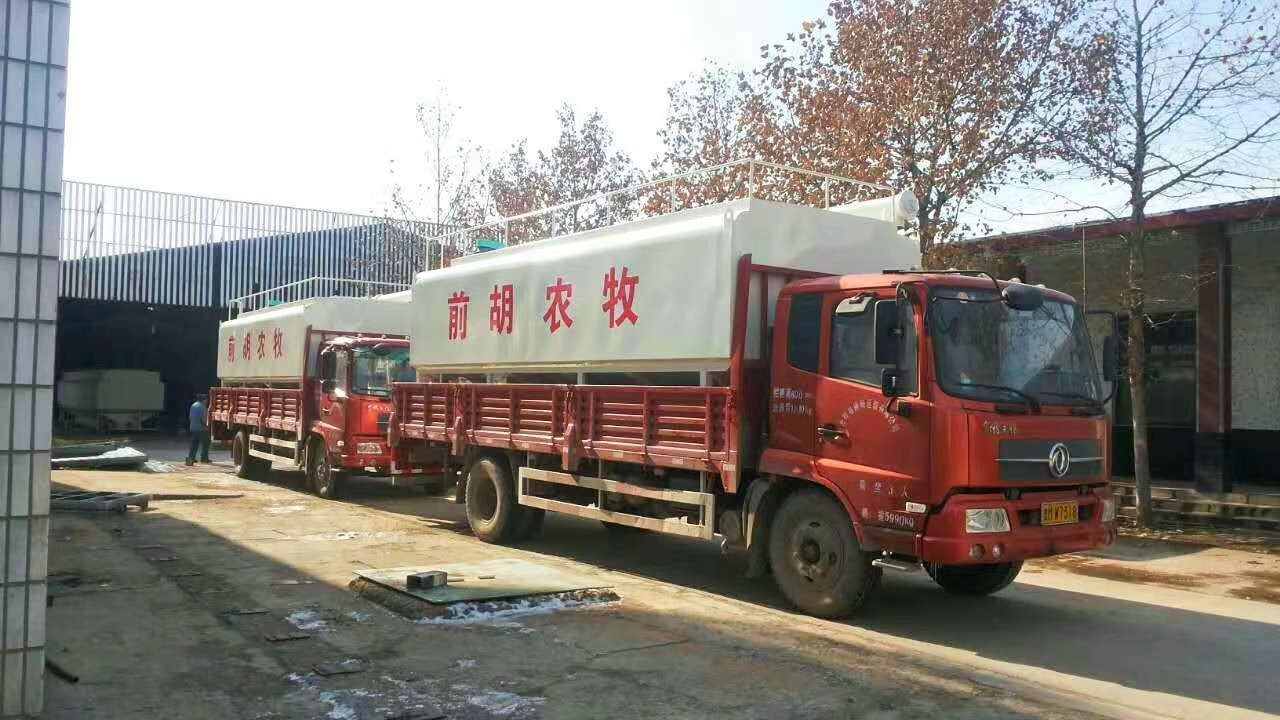 散裝飼料罐直接安裝在貨運車上,車、罐分體式(shì)組成。